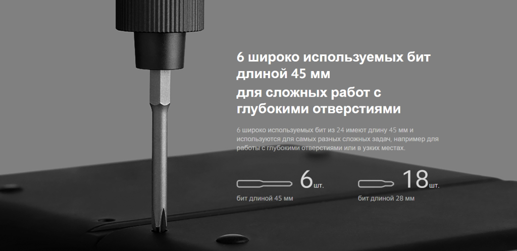 | Комплектация | отвертка, биты для отвертки 24 шт., кабель для зарядки USB Type-C, контейнер для хранения, документация |